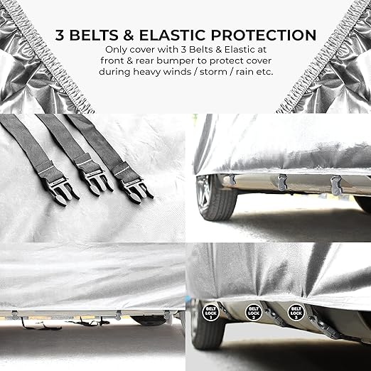 - [THREE BELTS & ELASTIC BOTTOM] - this waterproof car cover is the only car cover with 3 body belts & elastic bottom to protect cover during strong winds / storm / rainfall and prevents it from flying off and exposing your car. Waterproof Car Covers / Car Covers Waterproof.