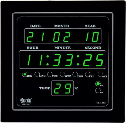 The AJANTA Digital 25.4 cm x 25.4 cm Wall Clock (Green, Black, With Glass, Standard) is a versatile and modern addition to your home or office decor. This digital wall clock features a vibrant multicolor dial encased in a sturdy plastic frame with a brown finish. Its sleek design is protected by a clear glass cover, ensuring durability and easy readability. The clock is battery-powered, requiring only one AA battery, making it both practical and easy to maintain.
