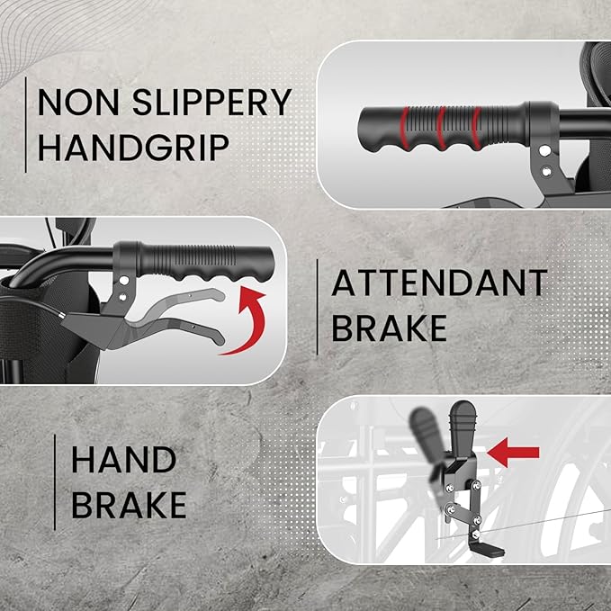 Brake System and Easy Transport: Handbrake System with Attendant Brake for reliable braking. Foldable design ensures easy storage and transportation.