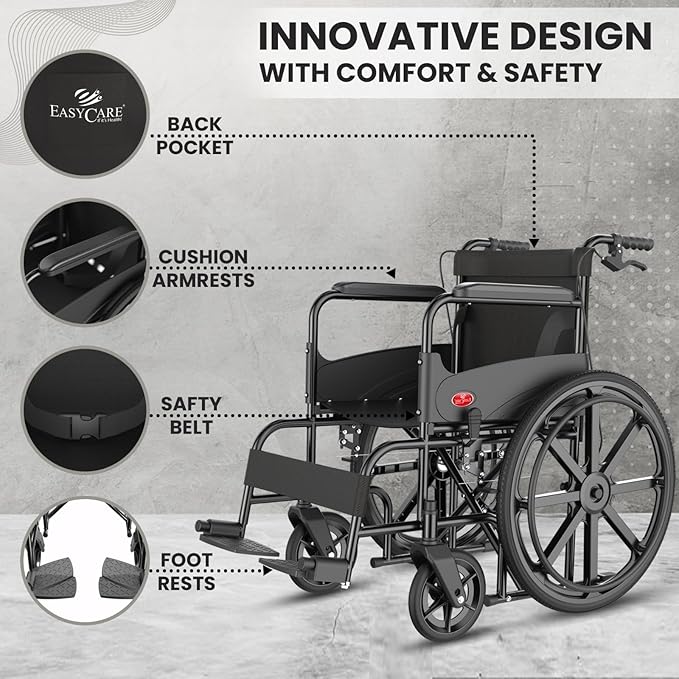 EASYCARE Foldable WITH Hand & Attendant Brake Wheelchair for Old People and Patient, Suitable for Indoor & Travel-Friendly with Adjustable & Comfort Seat Belt with Footrests, Wheel Chair