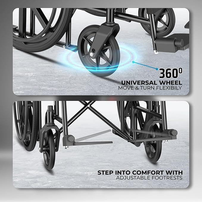 𝗙𝗢𝗟𝗗𝗦 𝗘𝗔𝗦𝗜𝗟𝗬 𝗙𝗢𝗥 𝗧𝗥𝗔𝗡𝗦𝗣𝗢𝗥𝗧: The Compact Design Folds Easily, With Swing-away Footrests That Lock in Place for Convenient Storage and Transport in Car Trunks. This Feature Makes It a Great Choice for Wheelchairs for Office Use and Wheelchairs for Old People Folding.