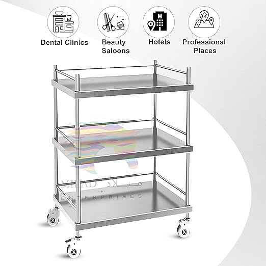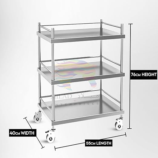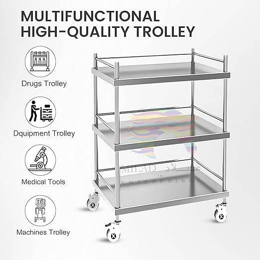 - ➤ 𝗩𝗘𝗥𝗦𝗔𝗧𝗜𝗟𝗜𝗧𝗬:-Hospital Trolleys are designed for various purposes, such as transporting medical equipment, supplies, medications, or even serving as mobile workstations for healthcare professionals. This hospital Trolleys often come with 3 shelves or compartments for organized storage of medical supplies, instruments, or patient files.
