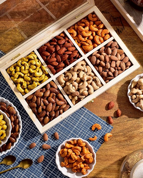 - Diwali Gift Box contains: Peri Peri Almond & Cashew 120g each, Himalayan Pink Salted Almond & Cashew 100g each, Black Pepper Mint Almond & Cashew 100g each.