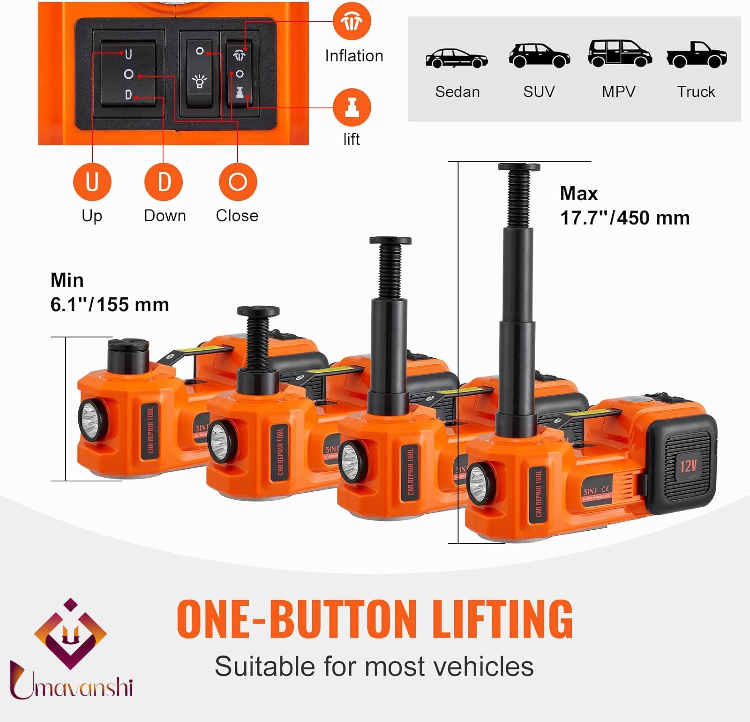 - Powerful Electric Car Jack: Lifting capacity: 5.0 tons/11023 lbs. Lifting Range: 6.1''-17.7" / 155-450 mm. This electric car jack kit is a lifesaver during roadside emergencies and can be used for at-home garage repairs. It matches all autos, sedans, SUVs, trucks, or vehicles that suit its capacity.